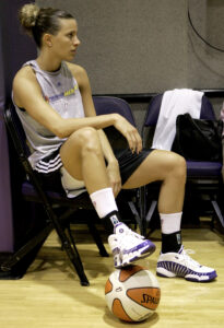 Phoenix Mercury guard Kelly Mazzante rests during basketball practice Monday, Sept. 10, 2007, in Phoenix. The Mercury face the Detroit Shock in Game 3 of the WNBA Finals Tuesday in Phoenix. (AP Photo/Matt York)
