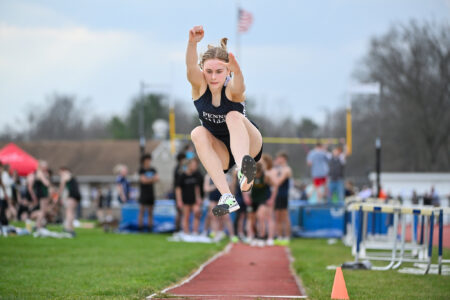 - TIM WEIGHT/For the Express A Penns Valley athlete performs a jump during a quad meet against Hollidaysburg, Forest Hills and Greater Johnstown on Tuesday, March 31, 2026, at Penns Valley.