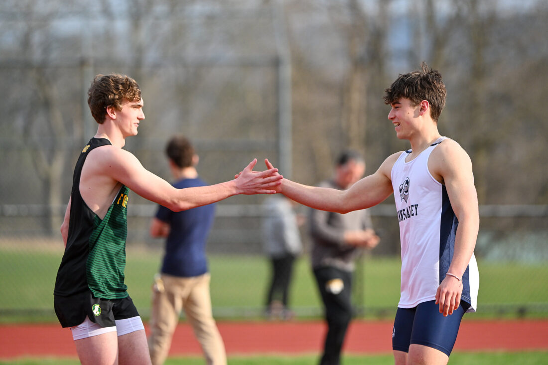 TIM WEIGHT/For the Express Penns Valley's Noah Patel shares an exchange with a Forest Hills athlete after taking second in the high jump during a quad meet against Hollidaysburg, Forest Hills and Greater Johnstown on Tuesday, March 31, 2026, at Penns Valley.