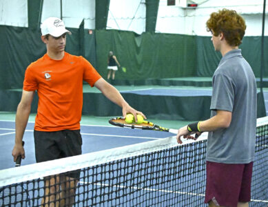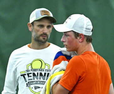 RALPH WILSON/For The Express Jersey Shore coach Seth Hensler meets with Ryder Fink at the end of the semifinal round of District 4 singles tournament at the Central PA Tennis Center last spring. Fink is one of three returning district semifinalists from last year, joined by Montoursville’s Teli Bobotas and David Sommer of Danville, in this year’s bracket. Fink became Jersey Shore’s first singles champion last year in program history and is looking to win a repeat title this year as the singles tournament is scheduled for Saturday at Williamsport High School.