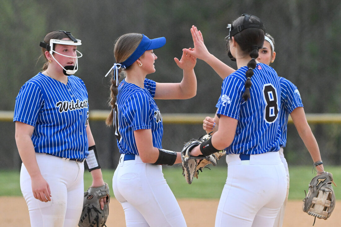 TIM WEIGHT/For the Express Central Mountain softball players high five during a softball game against Mifflin County on Friday, April 10, 2026, at Central Mountain. The Wildcats won 6-5.