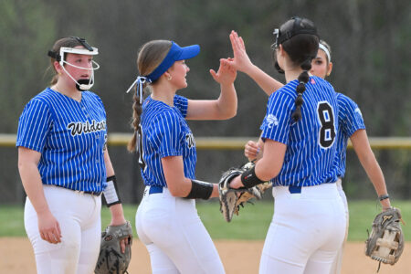 - TIM WEIGHT/For the Express Central Mountain softball players high five during a softball game against Mifflin County on Friday, April 10, 2026, at Central Mountain. The Wildcats won 6-5.