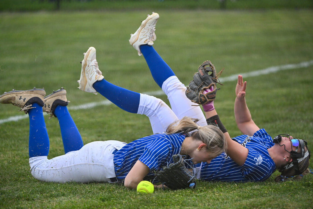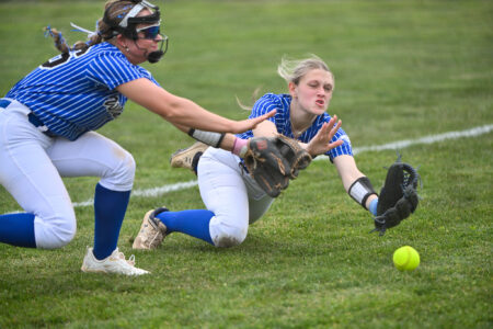 - TIM WEIGHT/For the Express Two Central Mountain fielders dive for a loose ball during a softball game against Mifflin County on Friday, April 10, 2026, at Central Mountain. The Wildcats won 6-5.
