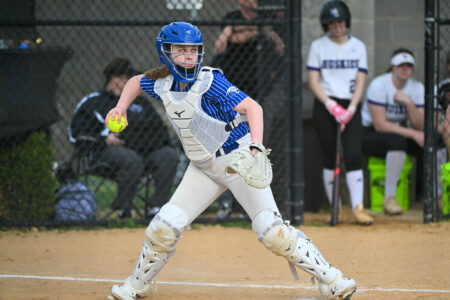 - TIM WEIGHT/For the Express Central Mountain catcher Elise McKean (15) throws the ball to a teammate during a softball game against Mifflin County on Friday, April 10, 2026, at Central Mountain. The Wildcats won 6-5.