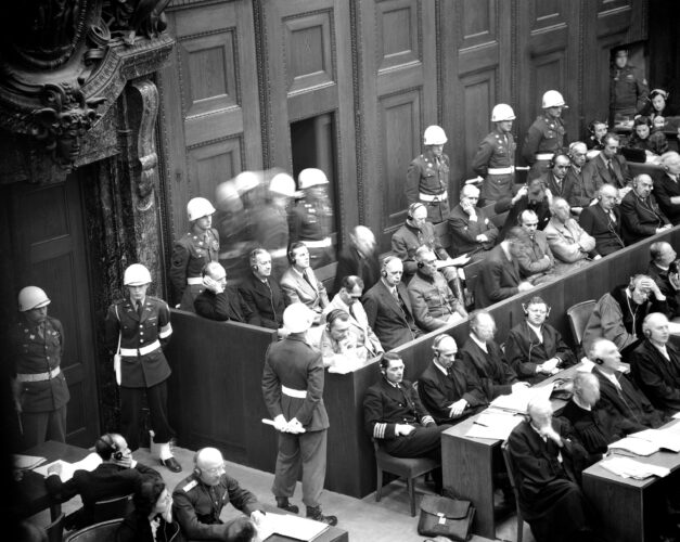 Hermann Goering, center, makes copious notes while Rudolf Hess, sitting beside him, dozes off during the proceedings of the war crimes trial at Nuremberg on Dec. 4, 1945.