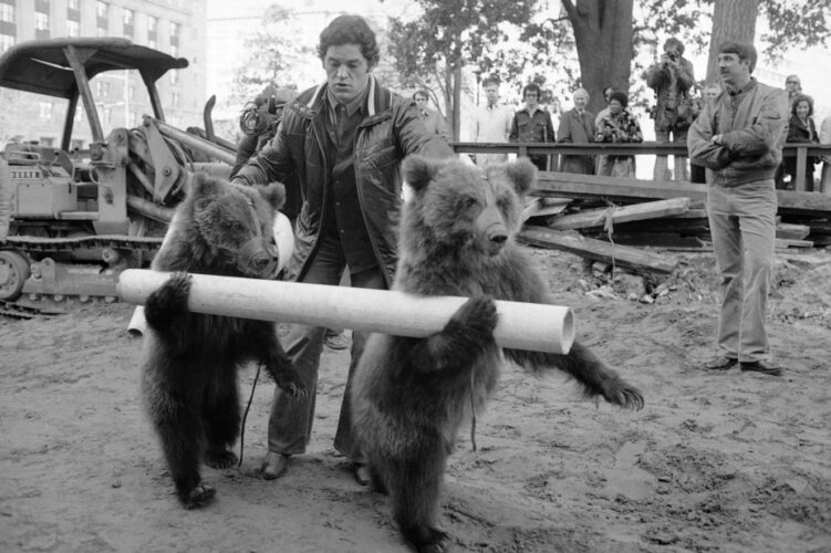 Two Russian bear give subway construction workers a paw (hand) as they stump for publicity in Washington, Friday, Dec. 5, 1975. The Soviet Circus opens in the nation’s capital.