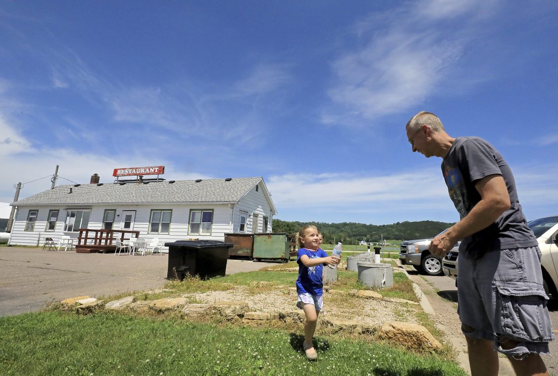 Juliet Hein, daughter of Picadilly Lilly owner Jessica Hein, offers water to arriving pilot Ed Asmus outside the restaurant on the grounds of the Tri-County Airport in Lone Rock, Wis., Tuesday, June 30.