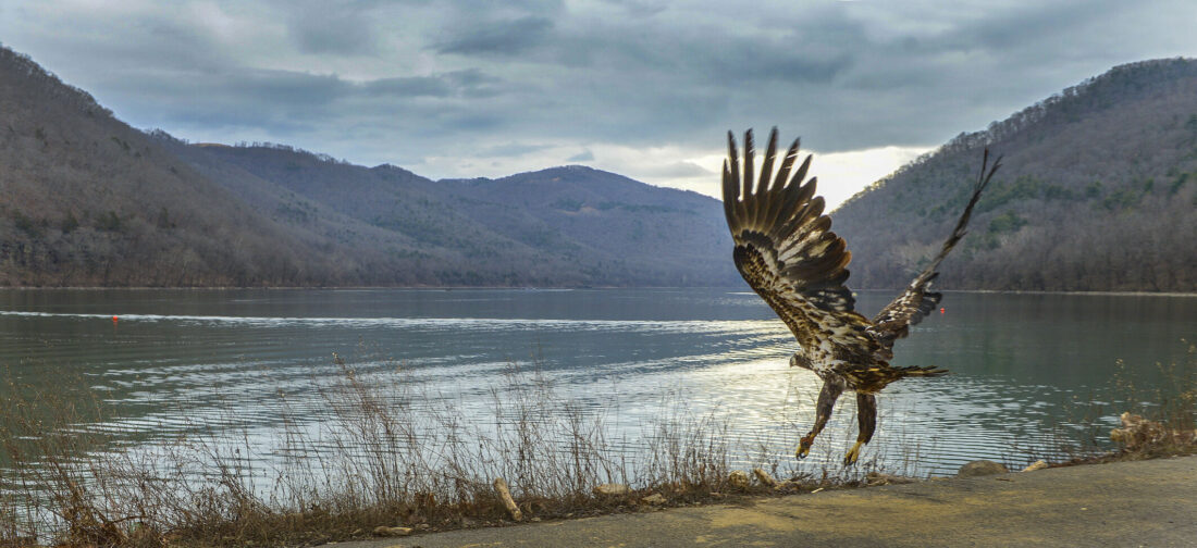 But recently, at the edge of Bluestone Lake, the eagle, named Monroe IV by followers of the Three Rivers’ Facebook page, demonstrated how far he had progressed since October.