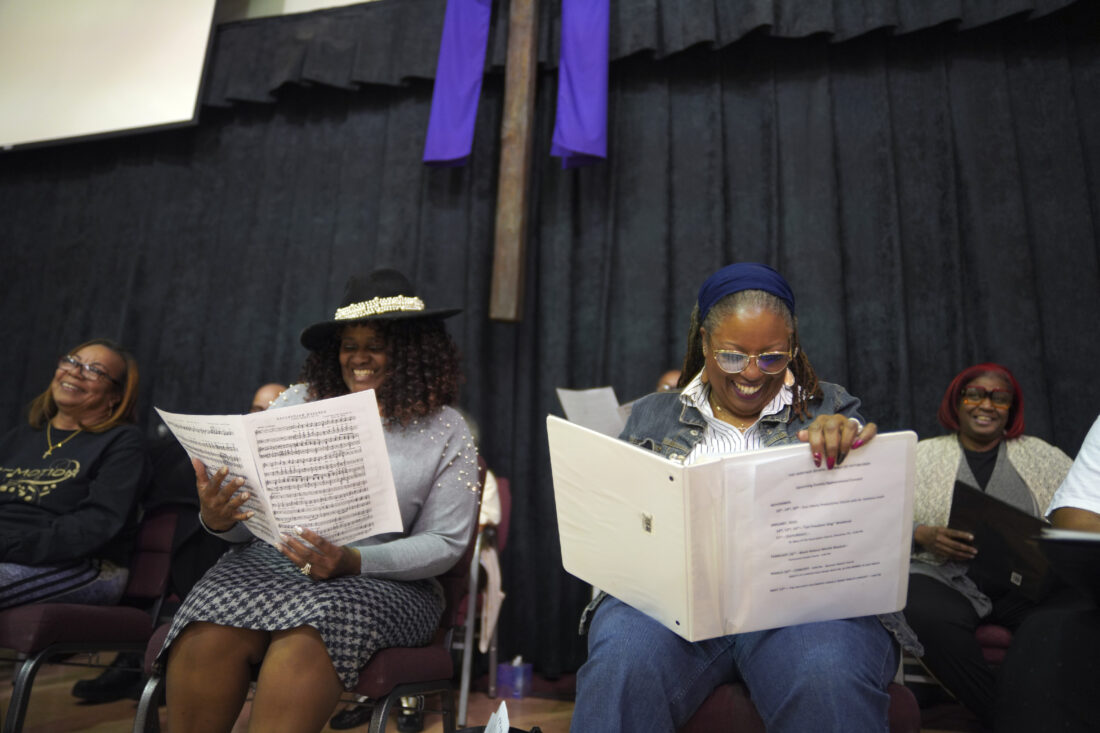 AP Photo/Jessie Wardarski Members of The Heritage Gospel Chorale of Pittsburgh, from left, Marleen Tucker, L. Twila Davis, and Jocelyn Scott, laugh between songs during a rehearsal for an upcoming concert honoring the late gospel composer, musician and publisher, Charles Henry Pace, on Monday, March 6, at Bethany Baptist Church in Pittsburgh.