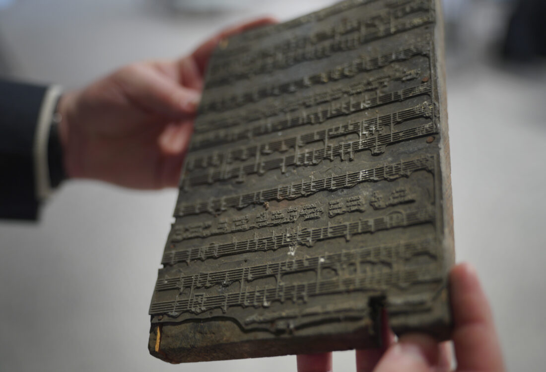 AP Photo/Jessie Wardarski Lynch holds a printing plate that gospel composer and publisher Charles Henry Pace used to print sheet music, on Tuesday, Feb. 28, at the University of Pittsburgh, in Pittsburgh.
