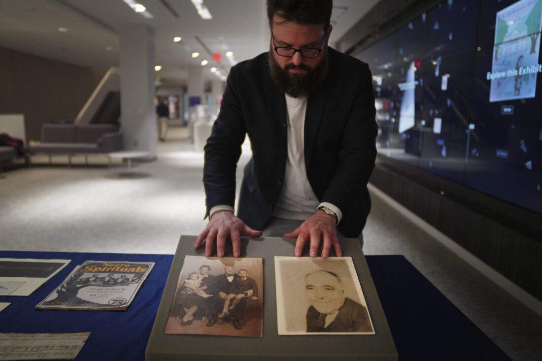 AP Photo/Jessie Wardarski Christopher Lynch, music historian and project coordinator with the Center for American Music at the University of Pittsburgh, adjusts a set of photos of gospel musician, composer and publisher Charles Henry Pace and his family, on Tuesday, Feb. 28, at the University of Pittsburgh, in Pittsburgh. When organizing the Pace archives, which are housed and owned by the university, Lynch discovered the composer was an early pioneer of gospel music and one of the early and only publishers of Black artists in the niche genre.