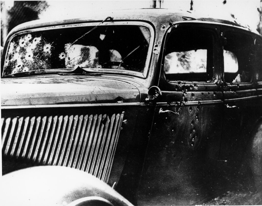 The bullet-riddled automobile in which the bandits, Clyde Barrow and Bonnie Parker, were trapped, shot and killed on a Louisiana road is seen May 24, 1934. Officers waited for the desperados near Arcadia, La., and pumped 167 bullets into the car.