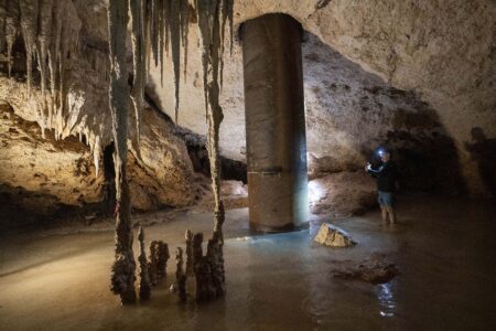 Today, he wanders into a small section of the caverns known as Aktun Tuyul, less than an hour from the tourist city of Playa del Carmen. As the 58-year-old Mexican walks past layers of stalactites and steel pillars burrowing into the rock formations, the cave’s darkness is broken by wagon wheel-sized holes drilled into the roof of the cave, where even more pillars will be implanted.