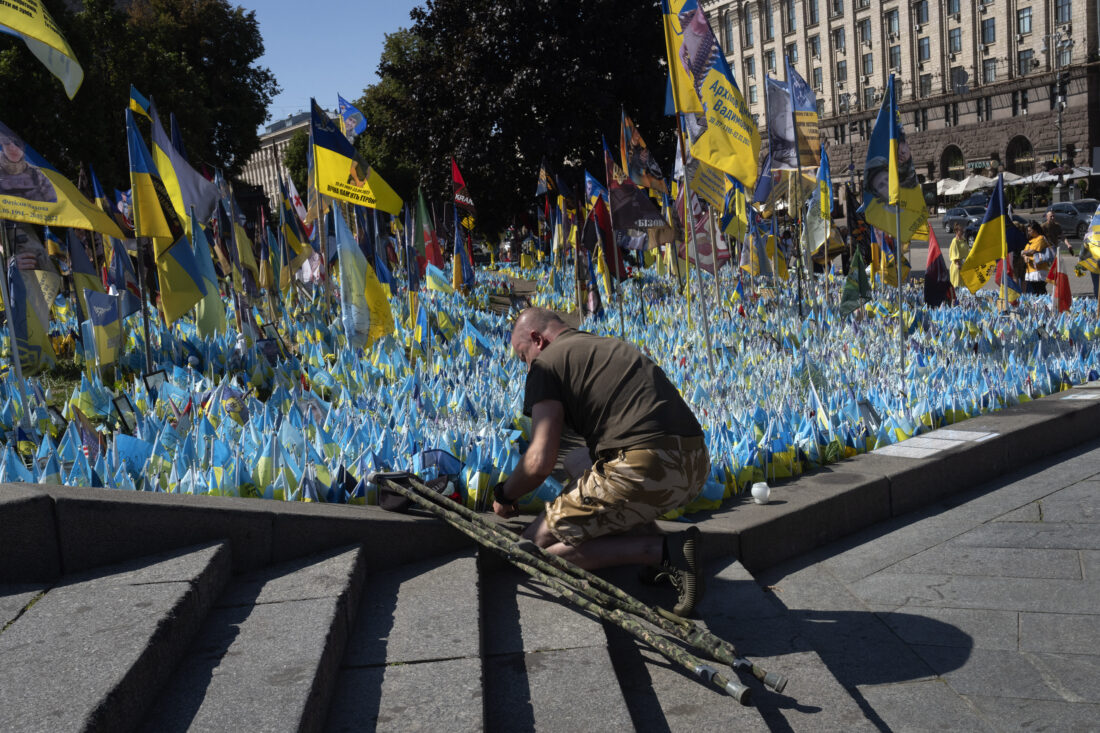 AP Photo/Efrem Lukatsky A veteran pays his respect at a makeshift memorial for fallen Ukrainian soldiers during the Ukrainian Independence Day on Independence Square in Kyiv, Ukraine, Saturday, Aug. 24.