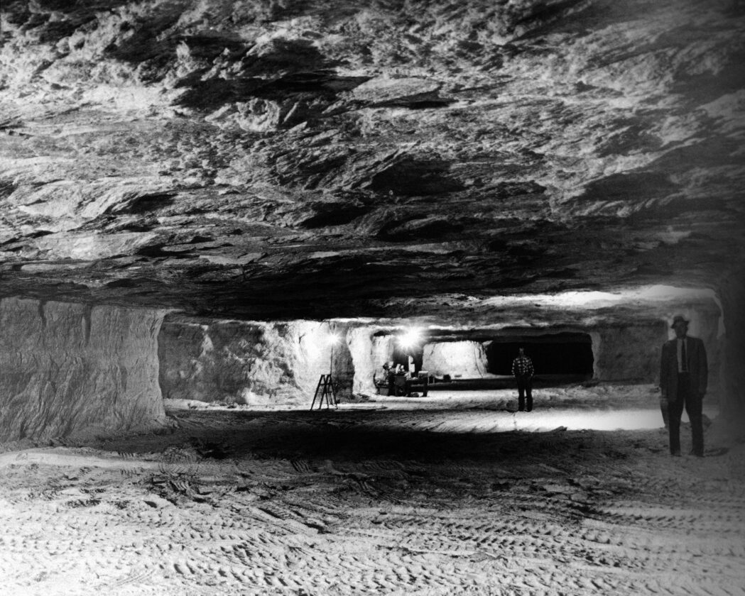 View of a huge cavern carved 650 feet underground near Hutchinson, Kansas, Sept. 19, 1961, by salt mining. The area includes 125 rooms, each 50 by 300 feet, separated by 10-foot walls of solid salt. The area was being leased for record storage and emergency space as a nuclear bomb shelter.