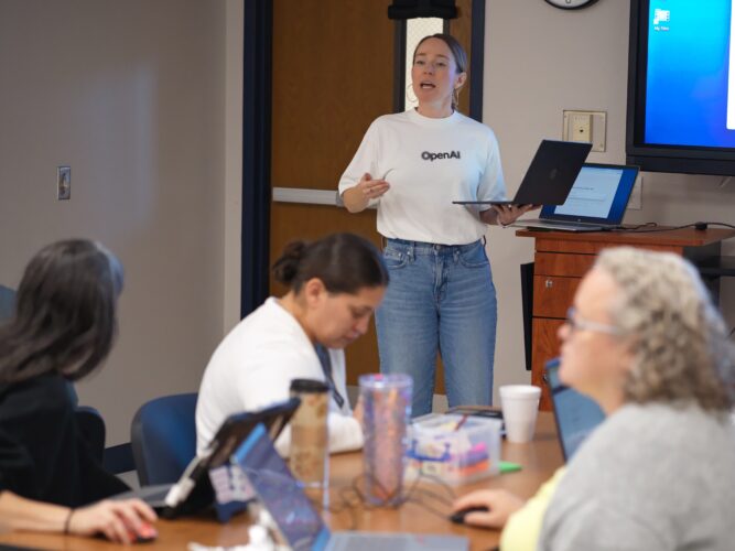 “We all know, when we talk about AI, teachers say, ‘Nah, I’m not doing that,'” trainer Kathleen Torregrossa told the room. “But we are preparing kids for the future. That is our primary job. And AI, like it or not, is part of our world.”