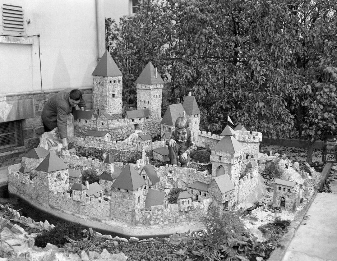 Rolf Bach, of Wiesbaden, West Germany, has built this small-scale replica of the nearby Castle of Sonnenberg for his children on Oct. 30, 1958. Made of small stones, pebbles and concrete, he built the castle in about 1,500 hours of work. He is shown here with one of his children.