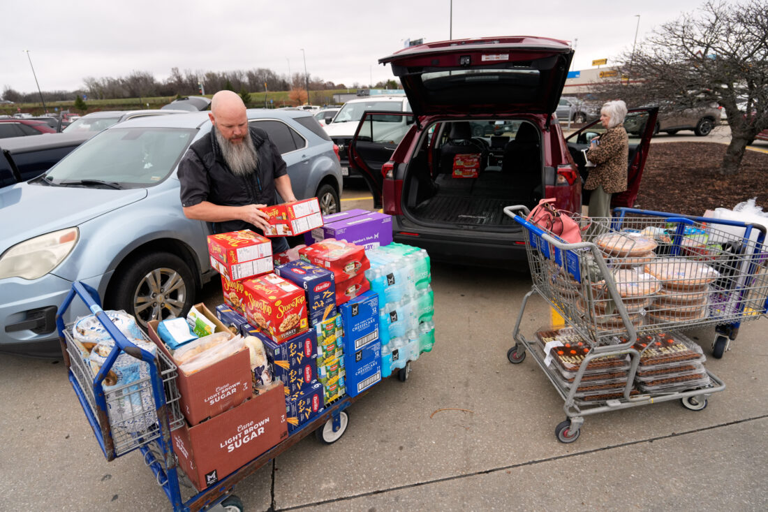 - High school cafeteria worker Shirley Mease, right, and son-in-law Rick Porter load up a car after shopping for supplies needed to make 700 free Thanksgiving meals for community members Tuesday, Nov. 25, 2025, in Springfield, Mo. (AP Photo/Jeff Roberson)