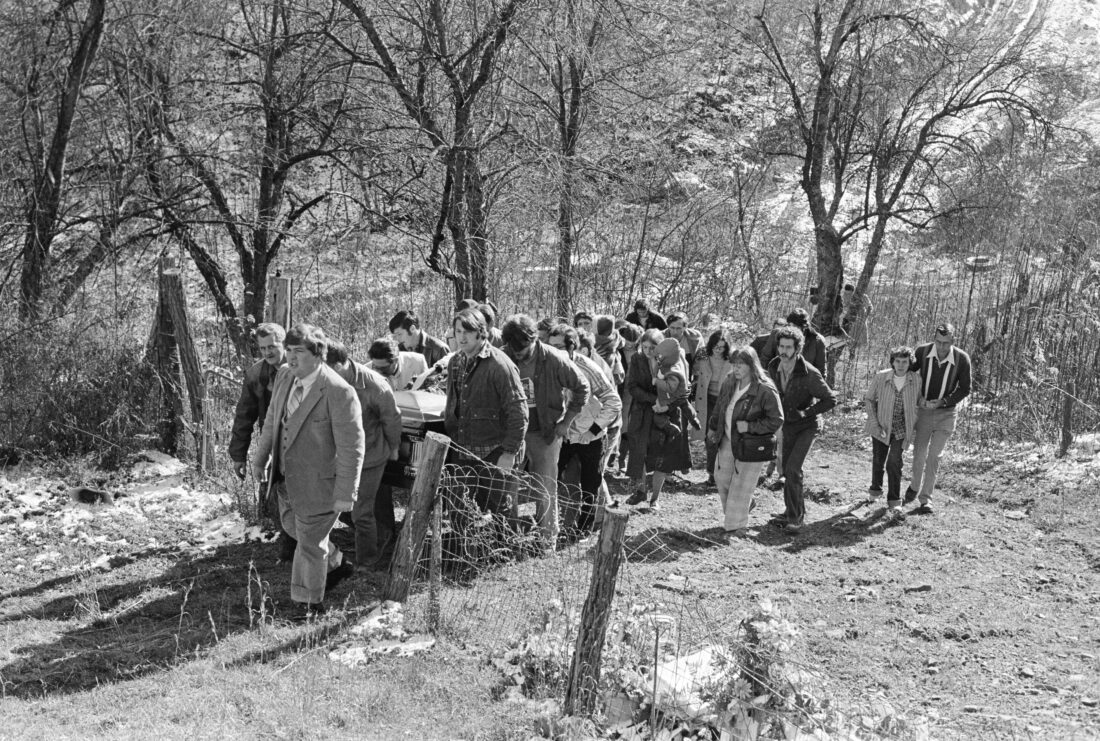 Pallbearers carry the casket of Robert “Bobby” Sloan up a hill to his burial site as family and friends follow behind near Topmost, Ky., Dec. 11, 1981. Sloan was one of eight miners killed in an explosion at the Adkins Coal Co. No. 18 mine on Dec. 7.