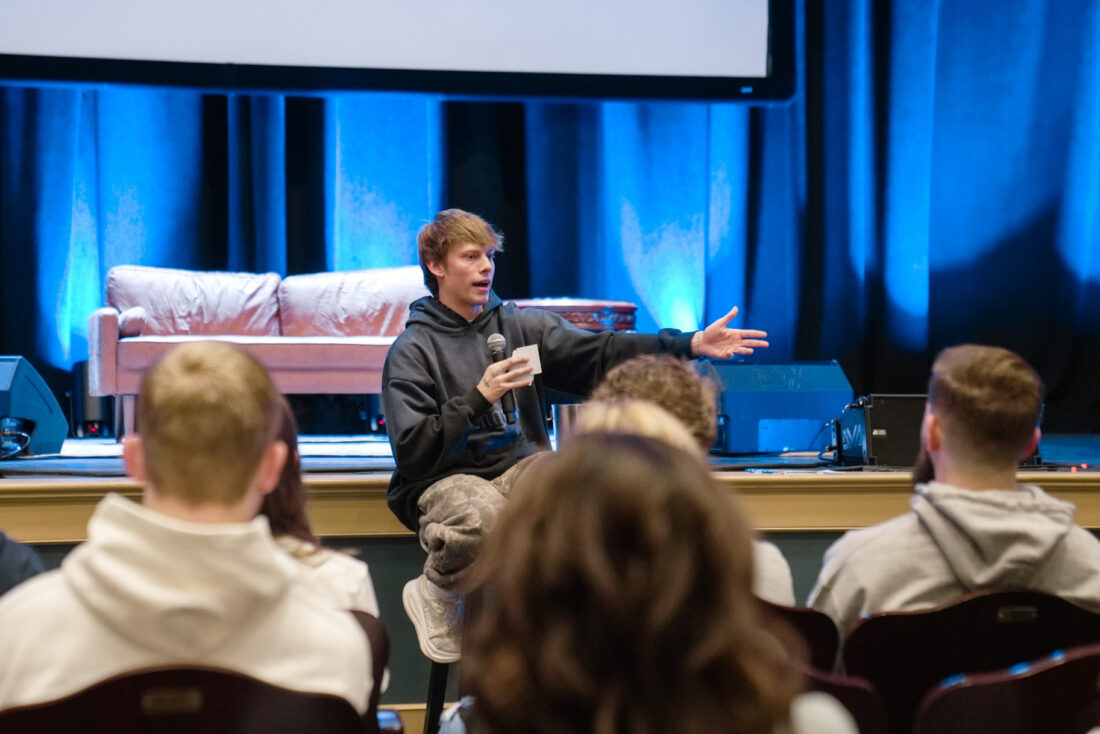 Divij Vaswani via AP In this handout photo provided by Divij Vaswani, Christian podcaster, Bryce Crawford, speaks to followers At Lyrical Theater, Sunday, Dec. 14, in Birmingham, Ala.