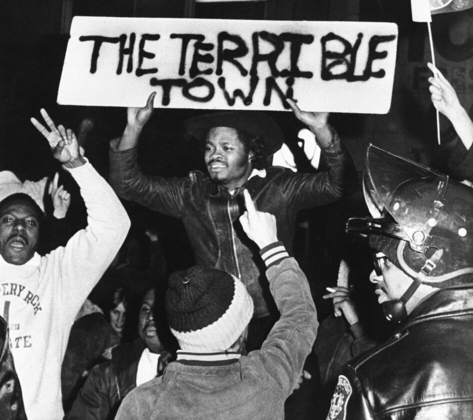 Steelers fans brave chilly weather to celebrate in a downtown Pittsburgh park after their team earned its fourth Super Bowl title by whipping the Los Angeles Rams at Pasadena, Calif., Jan. 20, 1980.