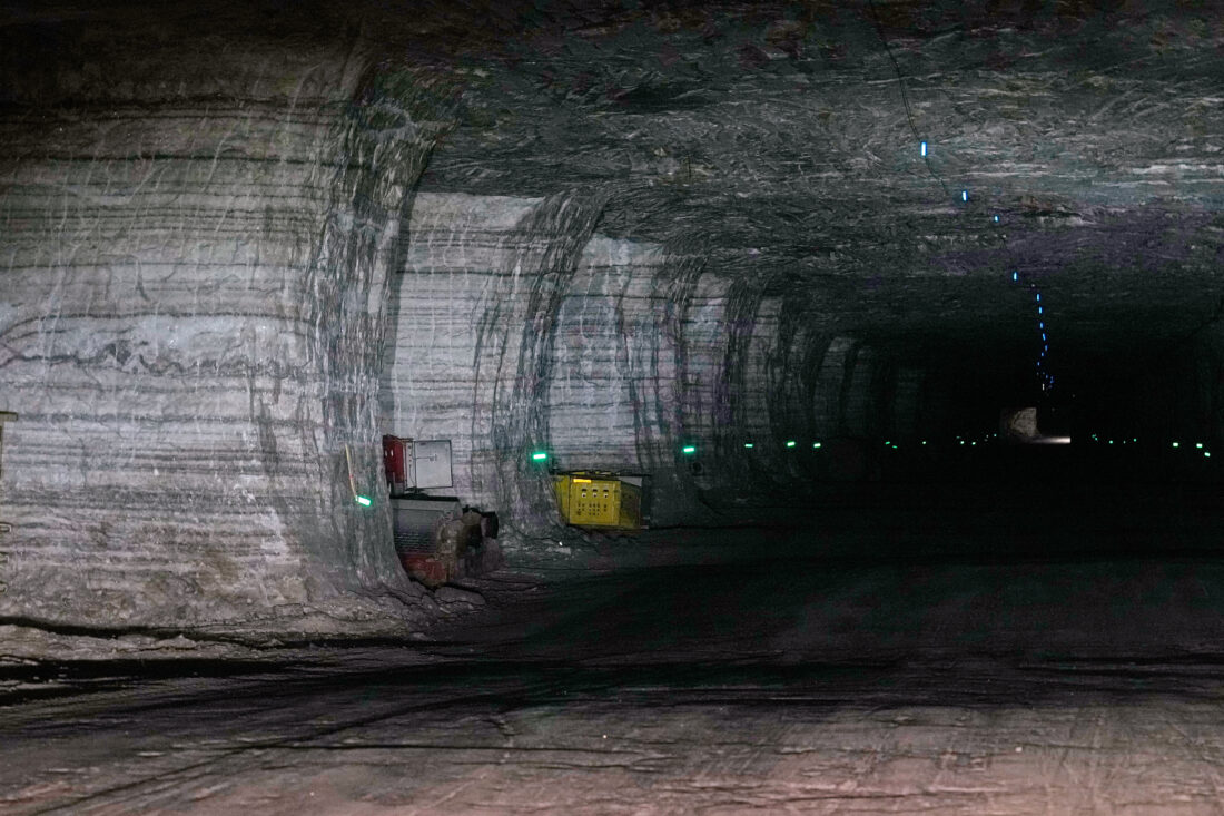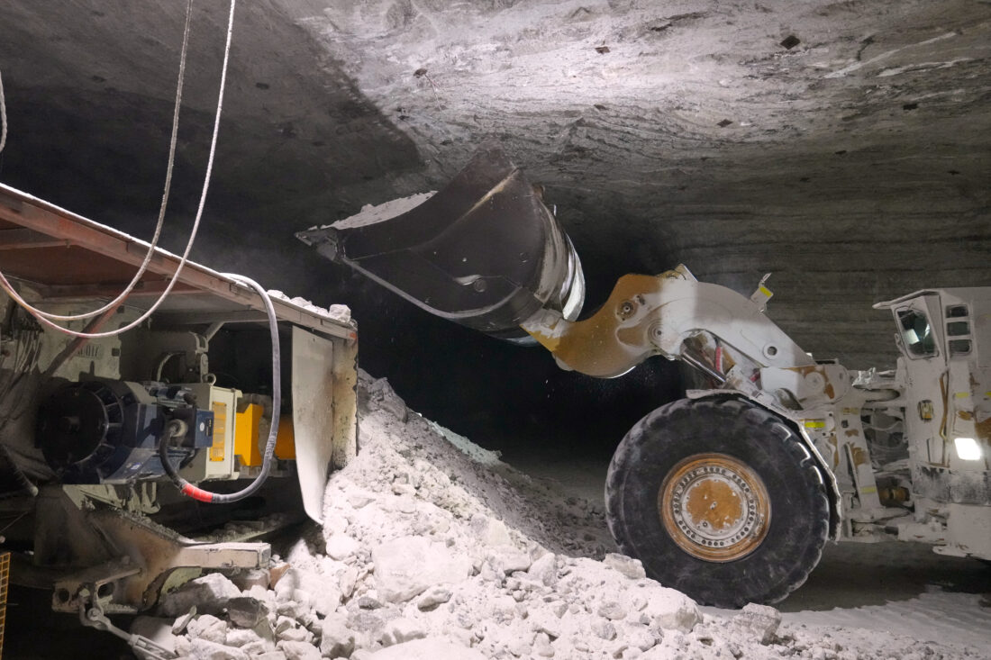 Inside, the mine is a maze of roughly rectangular caverns with chalky white walls and ceilings that extend for miles. It’s dimly lit and often pitch-black beyond the glare of headlamps and floodlights. Heavy machinery and conveyer belts rumble as small ATVs whisk miners around.